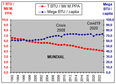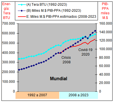 Fuente datos: EIA. Elaboración propia Las series de datos utilizadas para todos los países tanto en el consumo de Energía (BTU) como en el PIB-PPA ($) son de 32 años desde el año 1992 al 2023. En el análisis de los datos se ha verificado que, tras la crisis financiera del año 2008, se han producido en varios países importantes variaciones en la relación entre el consumo de energía y el PIB-PPA; y se han dividido los datos de los 32 años en dos series de 16 años cada una para mostrar gráficamente estas variaciones. La primera serie es del año 1992 al 2007, y la segunda del 2008 al 2023, y para un estudio más pormenorizado de los datos se han tomado series de 8 años: (1992-1999)-(2000-2007)-(2008-2015)-(2016-2023). La cantidad de energía necesaria para producir un unidad de PIB-PPA, puede ser diferente según el nivel de productividad técnica alcanzado por un País por su eficiencia energética productiva, pero en toda economía productiva, el crecimiento de la cantidad de energía per capita siempre es superior a la eficiencia energética debido al crecimiento constante del PIB-PPA por medios productivos. Ello se puede ver en el siguiente gráfico que compara la evolución Mundial de ambas variables del año 1992 al 2023.