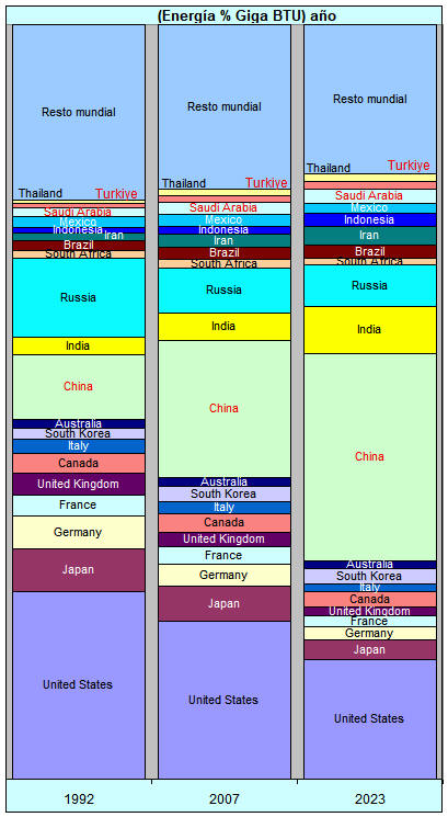 de cambio nominales. Las naciones de estudio seleccionadas son las que en el año 2023 tenían un consumo superior al 0,9% de la energía consumida mundialmente. Las naciones son:
