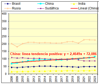 En China, la relación entre el PIB-PPA y el consumo de energía en el periodo (1992-2007) se mantiene constante con una disminución de las unidades de energía necesaria (BTU) para producir una unidad de PIB-PPA (Mil Millones ($) debido a la mejora continua de la productividad por la eficiencia energética, con una correlación entre ambas variables de r = 0975 En el periodo (2008-2023), la Crisis Financiera del 2008 y la pandemia de Covid-19 no tienen una incidencia significativa en la evolución del PIB-PPA, con una mejora considerable en la eficiencia energética a partir del año 2014, manteniendo una estrecha correlación entre ambas variables de r = 0,983 lo que denota el carácter productivo de la economía de China. En este periodo, a partir del año 2014, la brecha entre el PIP-PPA real y el estimado para obtener una correlación entre ambas variables de r = 0,983 no presenta diferencia, manteniendo sin cambios el carácter productivo de la economía de China. El valor estimado acumulado del PIB-PPA del periodo (2008-2023) respecto del PIB-PPA total de periodo (2008 2023), es igual a cero. El ajuste realizado para obtener este resultado cumple la condición 1ª. La tendencia gráfica entre en las dos variables correlacionadas se mantiene constante desde el año 2015 a 2023. La deuda oficial estimada de la economía de China fue del 71%.