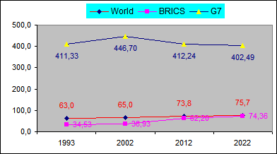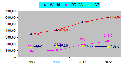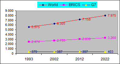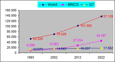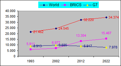 (Total Mundial), (Total G7), (Total BRICS), con un resultado de alta