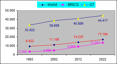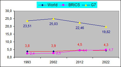 La comparación se establece entre los países del G7 y los países de los BRICS.